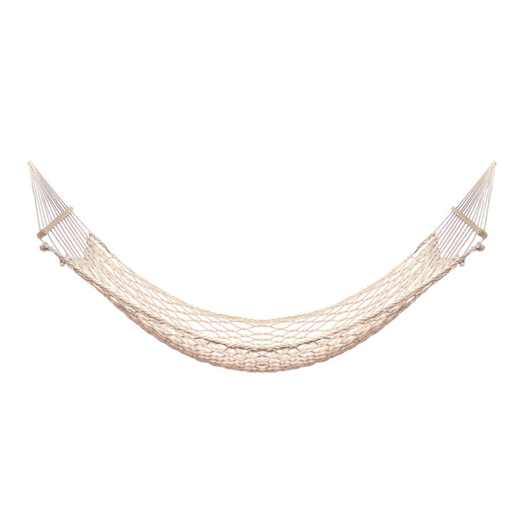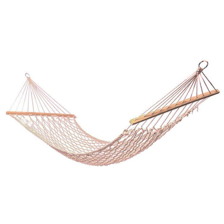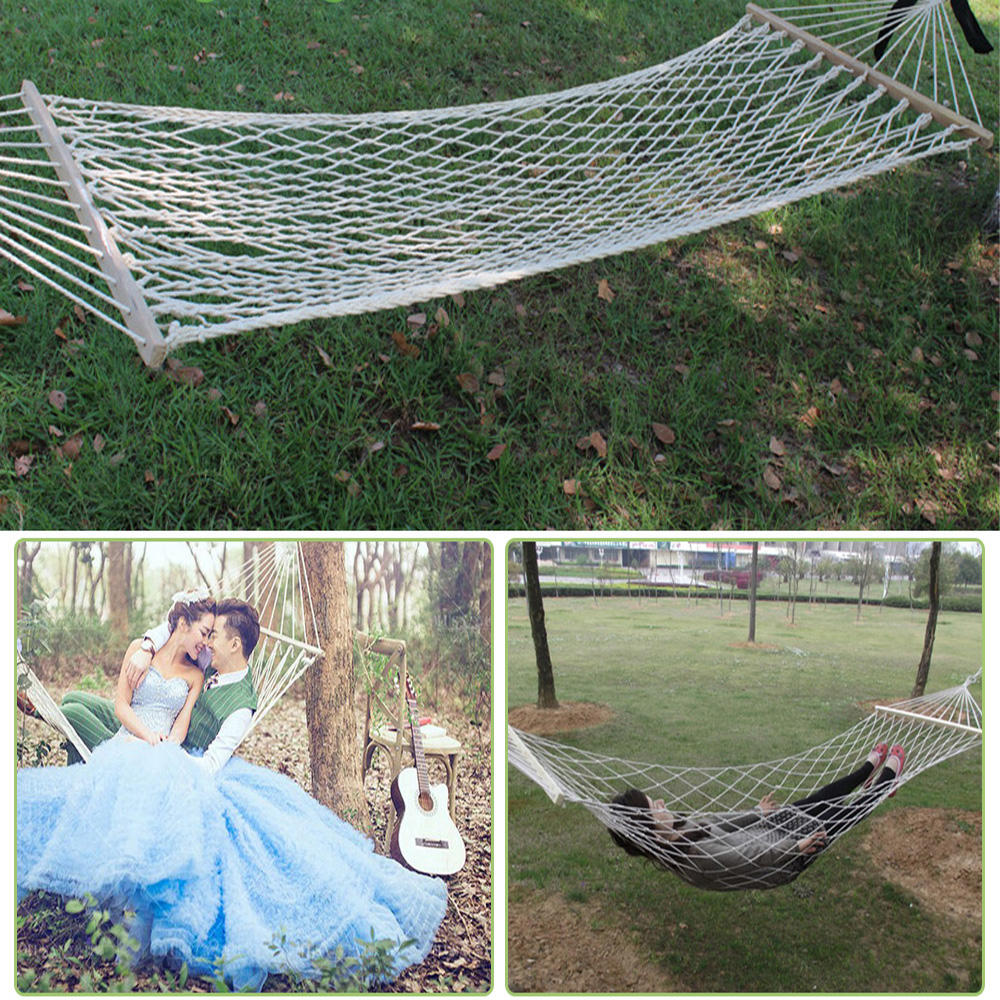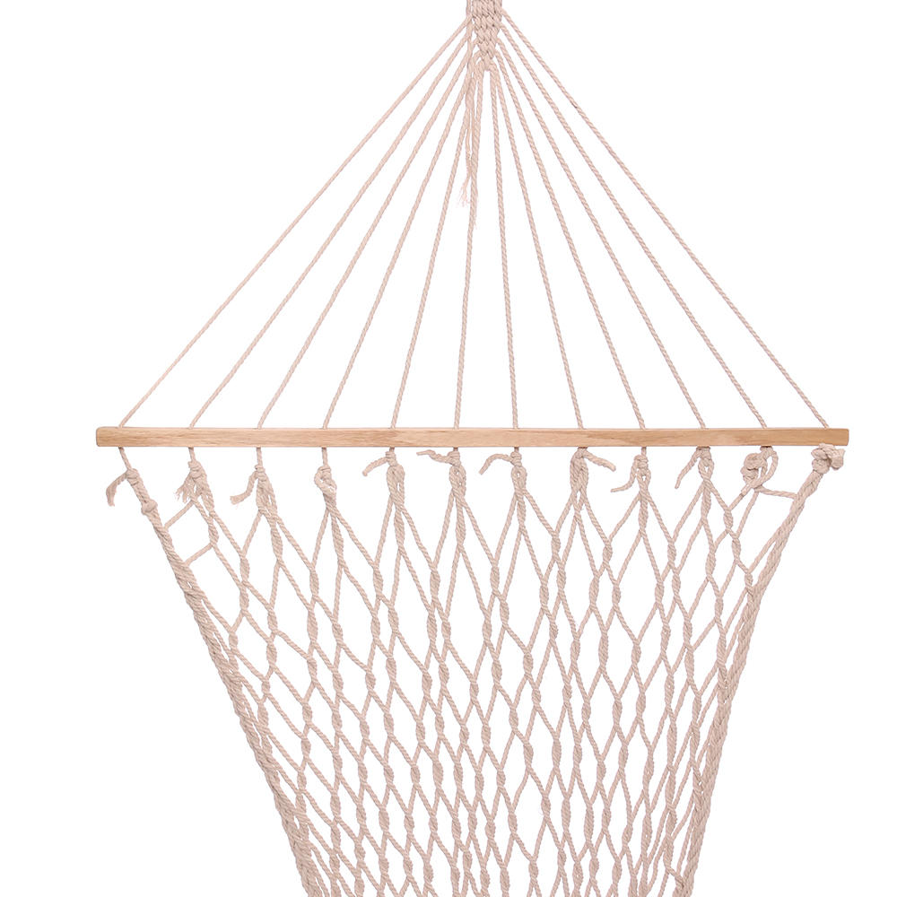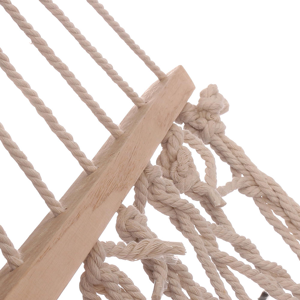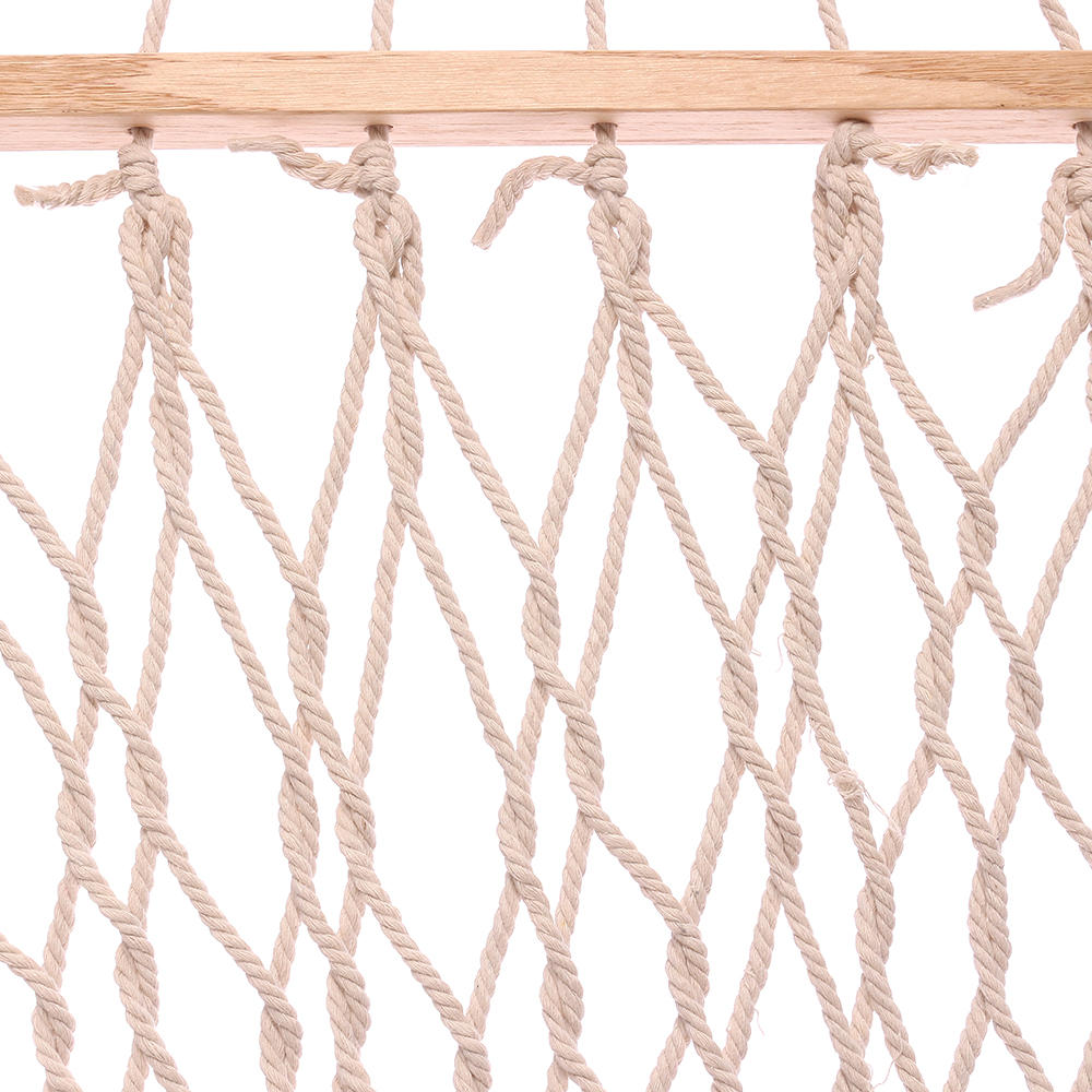1. Könnyen használható: Mindkét végén van egy hosszú fa rúd, amelyen keresztül a furatok lyukak vannak elhelyezve, hogy átmenjenek a tartó kötelek. Minden kötél szuper vastag és fonott a maximális tartósság és tartó érdekében. A 24 kötél összegyűlik és egy nagyon szép háromszögmintává szövi, amely egy gyűrűhöz kapcsolódik, és a láncszem használható a függőágy felakasztására.